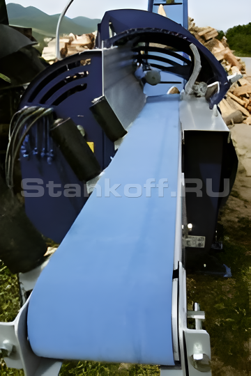 Ограничитель вылета бревна точно регулирует длину получаемого чурбака, обеспечивающее свободное падение в зону раскалывания. Длина вылета свободно регулируется от 200 до 500 мм с шагом 50мм, в зависимости от необходимой длины получаемых дров.Транспортер