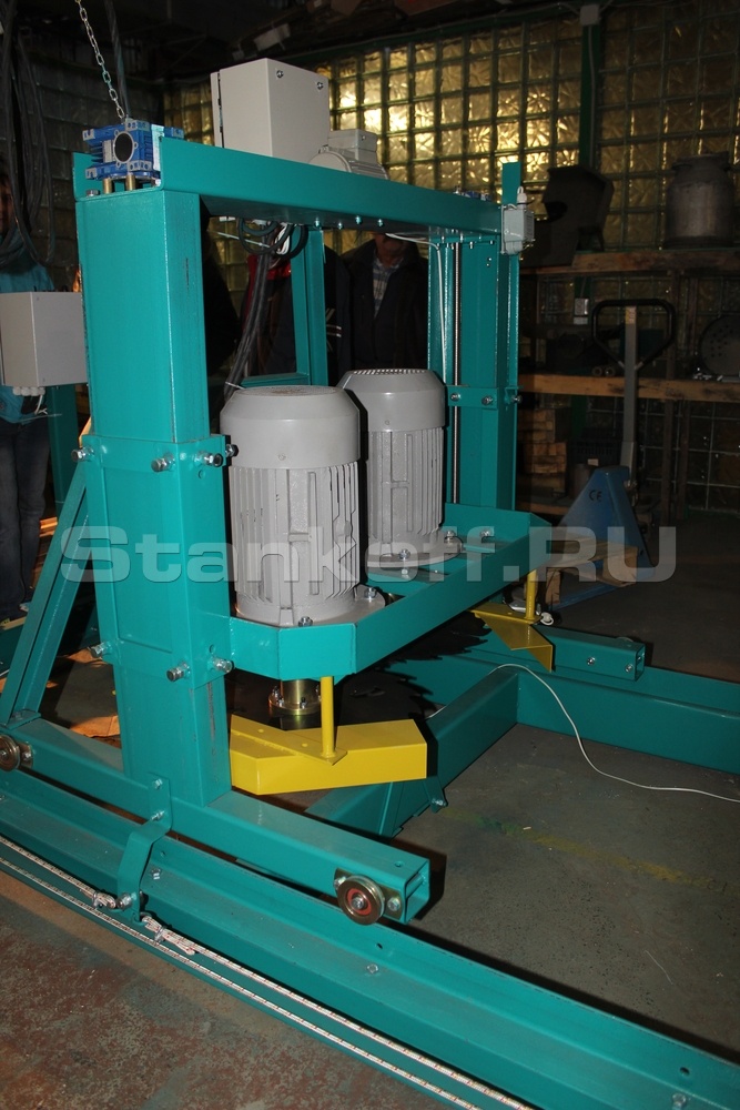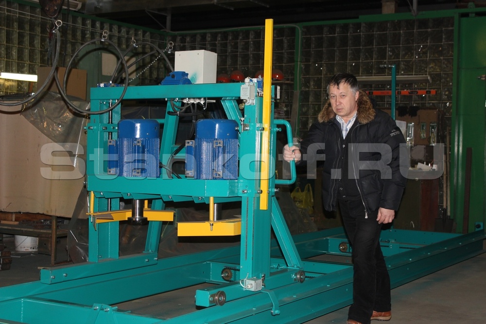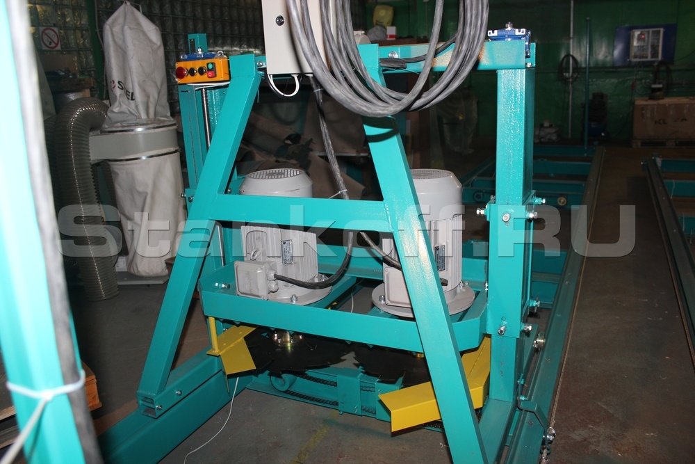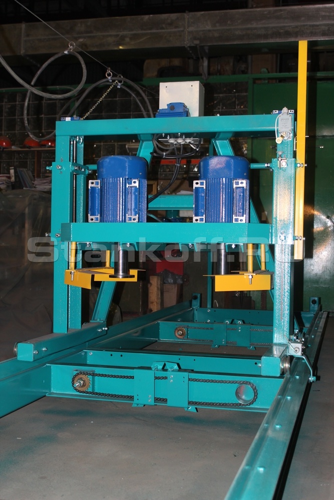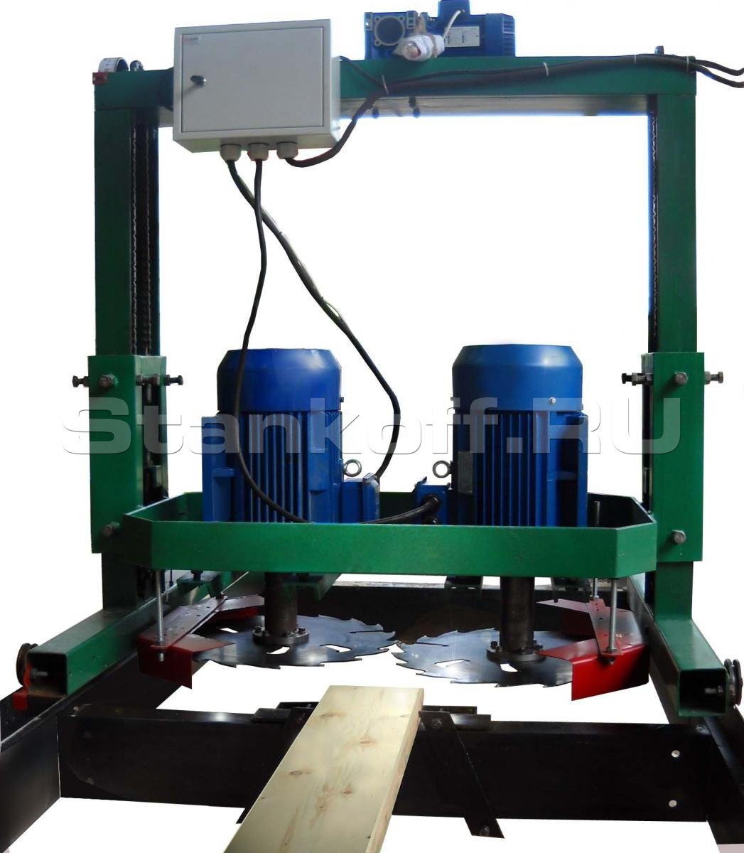 Бревно крепится на неподвижной станине станка. На станине выполнены направляющие, по которым перемещается пильная каретка. На каретке смонтирован суппорт, на котором закреплены два электродвигателя с пильными дисками. Распил бревна осуществляется двумя пилами, расположенными в одной горизонтальной плоскости. Пильная каретка перемещается вручную или с помощью электромеханической подачи со скоростью 4-12 м/мин. Электродвигатели с пильными дисками перемещаются посредством вертикальных ходовых винтов либо посредствам цепной передачи.