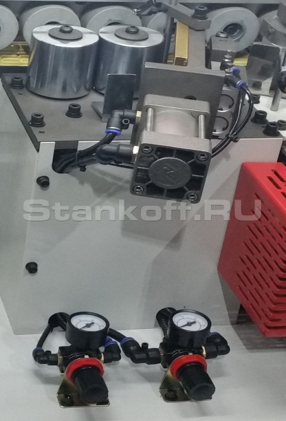 Давление на пресс группе задается с помощью пневматики, что гарантирует равномерное распределение усилий на кромку во время приклеивания.Узел чистовой торцевой обрезки